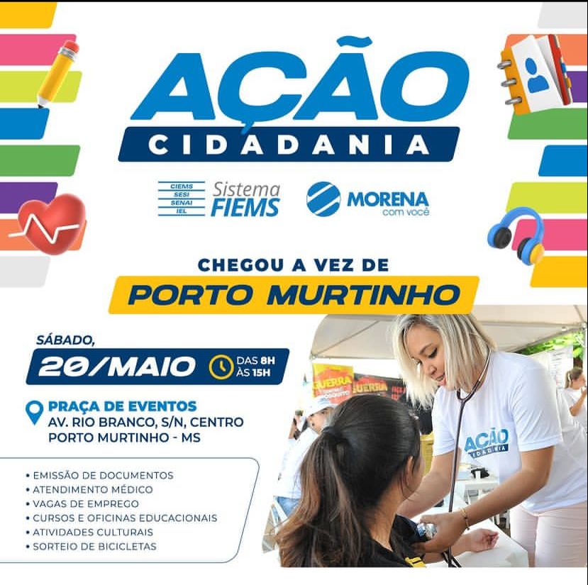 A Prefeitura Municipal de Porto Murtinho convida toda a população para estar presente neste sábado (20/05), na Praça de Eventos, para participar da Ação Cidadania, realizada pelo Sistema FIEMS e pela TV MORENA.