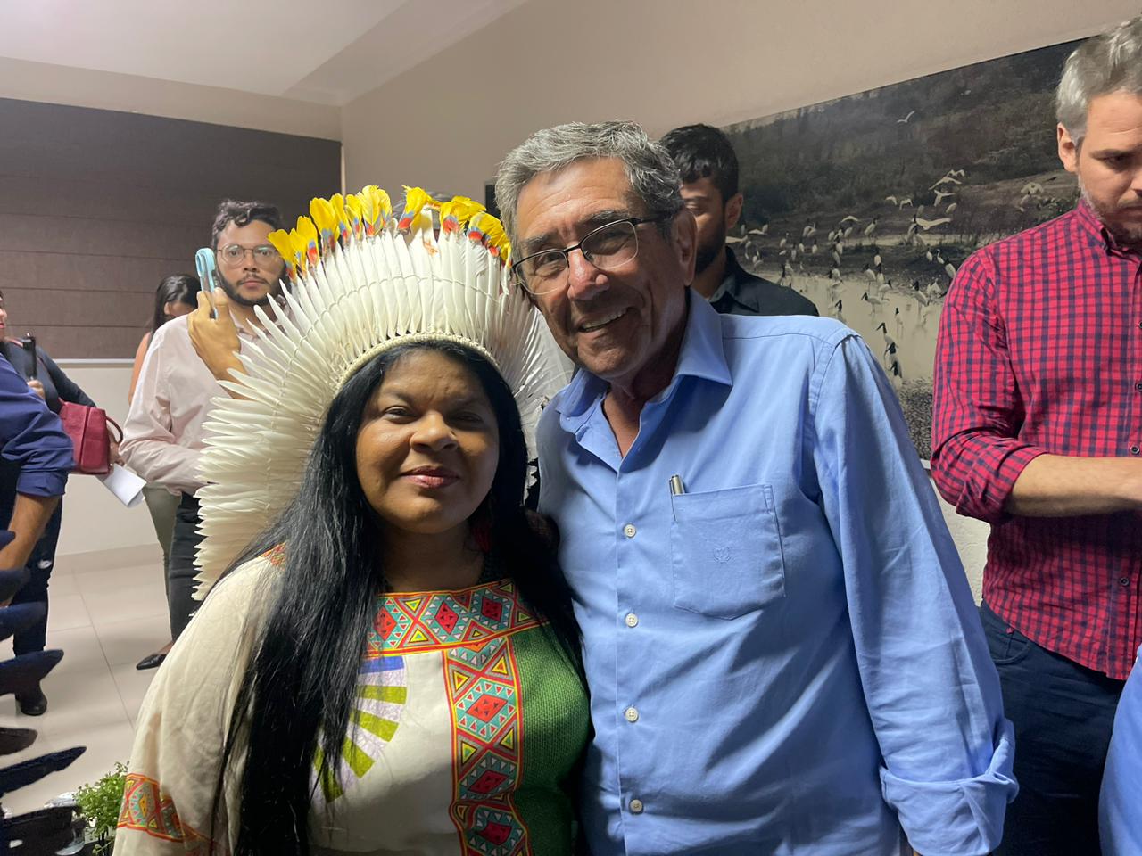 A comitiva também é composta por Eloy Terena, Secretário-Executivo do Ministério dos Povos Originários e Gasparini Kaingang, assessor de gabinete da Ministra Sônia Guajajara.