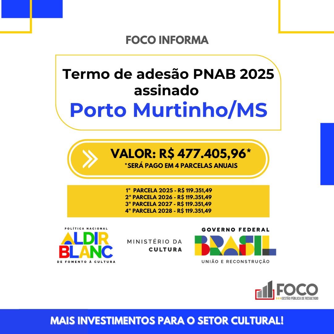 Porto Murtinho deu um importante passo no fortalecimento do setor cultural ao assinar, nesta segunda-feira (5), o termo de adesão à Política Nacional Aldir Blanc de Fomento à Cultura (PNAB) para o ciclo de 2025. Com a aprovação do plano de ação do município, estão garantidos investimentos no valor total de R$ 477.405,96, que serão repassados em quatro parcelas anuais até 2028.